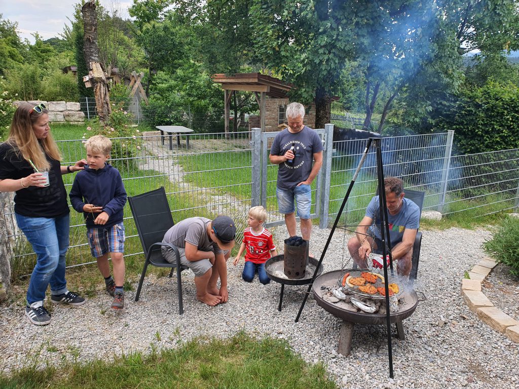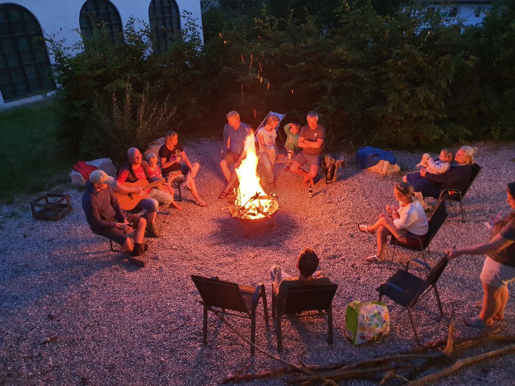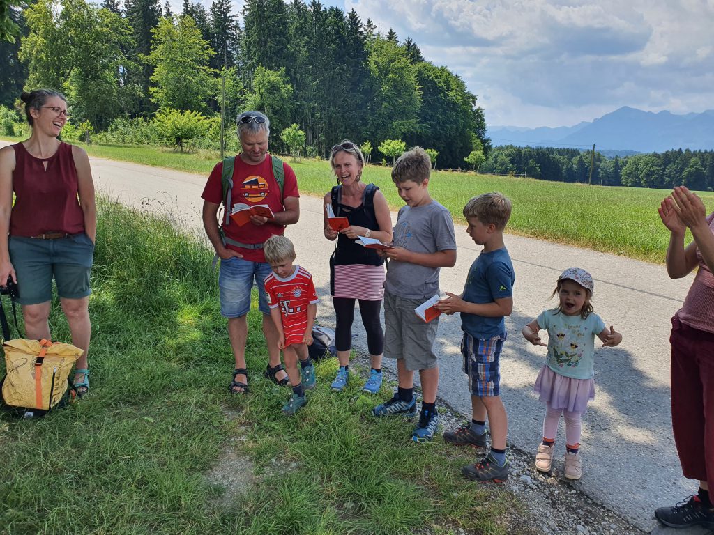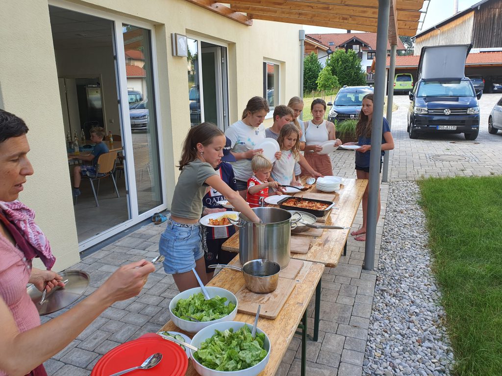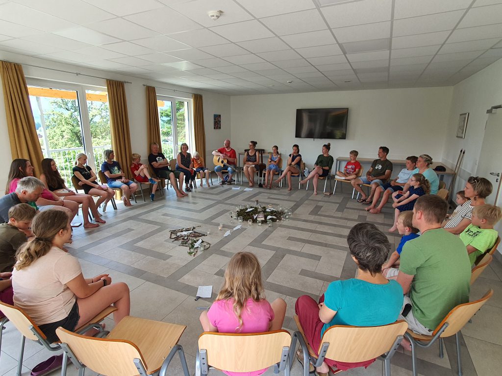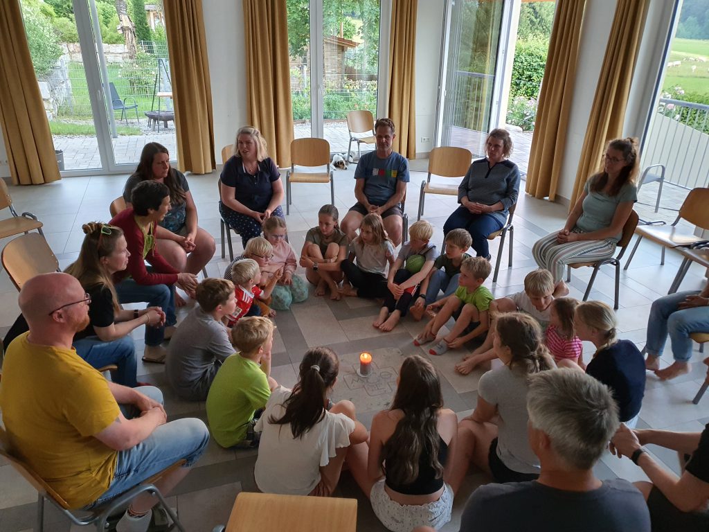 „Das müssen wir wieder machen!“, so ein Zitat einer Tochter bei der Heimfahrt. Was hatten die Familien alles erlebt? Am Freitag machten sich 9 Familien aus dem Talkessel auf, um im Marwanger Nepomuk-Huber-Haus ein Wochenende gemeinsam zu verbringen. Beim Grillen und dem anschließenden gemeinsamen Spielen lernten sich die über 30 Teilnehmer*innen kennen. Während die Kinder sich bei Kicker und Tischtennis vergnügten, versammelten sich die Eltern im Anschluss am Lagerfeuer. Nach einer kurzen Nacht und einem Morgenimpuls stand das Spiel „Familie ärgere dich nicht“ auf dem Programm. Dazu mussten die Familien während einer mehrstündigen Wanderung unterschiedliche Aufgaben lösen. Die Aufgaben, sei es das Singen eines Liedes, die Anfertigung eines Gruppenfotos, sportliche Tests oder Geschicklichkeitsaufgaben wurden mit Bravour gemeistert. Zurück im Selbstversorgerhaus freuten sich alle auf ein erfrischendes Bad im nahegelegenen Tüttensee. Das italienische Abendessen bereiteten verschiedene Kindergruppen vor und zeigten, dass sie schon selbstständig verschieden Gericht zubereiten können. Die Eltern genossen Pasta, Lasagne und Pizzaknödel. Am Lagerfeuer wurden dann, begleitet von Gitarrenklang, alte Gassenhauer gesungen. Der Abend endete mit einer Meditation. Die Kinder hatten dazu Naturmaterialien gesammelt und gestalteten daraus ein Mandala. Beim Gottesdienst am Sonntag stand der Adler im Mittelpunkt. Die Familien überlegten, wo sie sich getragen und geborgen fühlen. Gestärkt, wenn auch müde machten sich dann die Familien auf den Heimweg oder genossen noch ein Bad im See. Damit endete ein rundum gelungenes Wochenende.