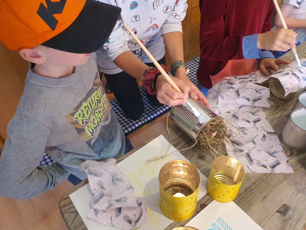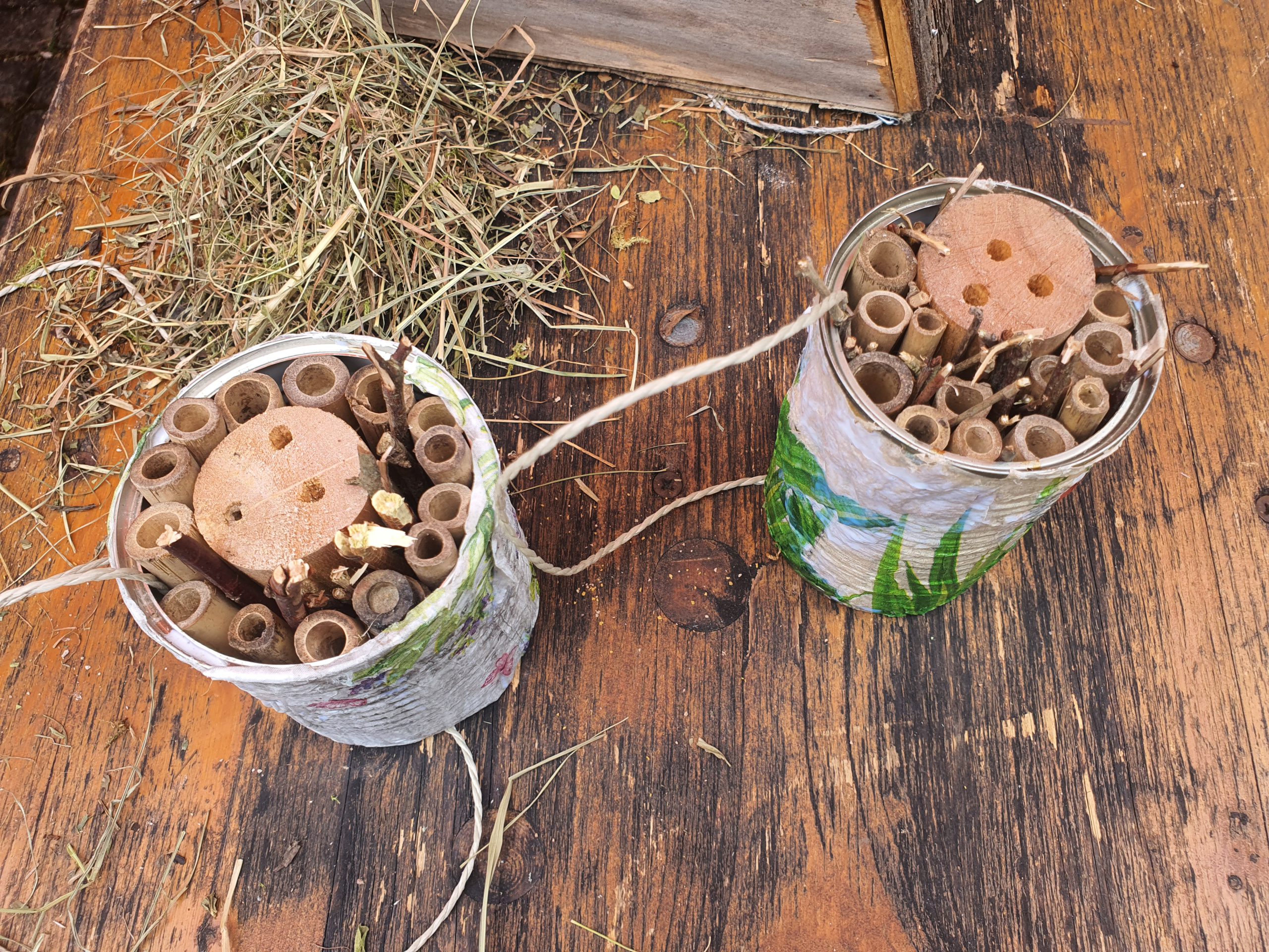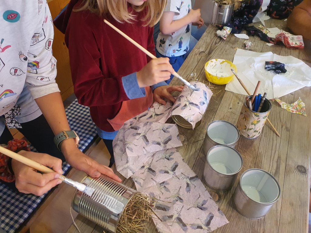 Handwerklich zu ging es beim Konservendosen verwandeln: ob in Windlichter oder zu schmucken Insektenhotels: mit Hammer und Nagel, Säge und Füllmaterialien und nicht zuletzt bunten Servietten entstanden viele schöne Schmuckstücke.