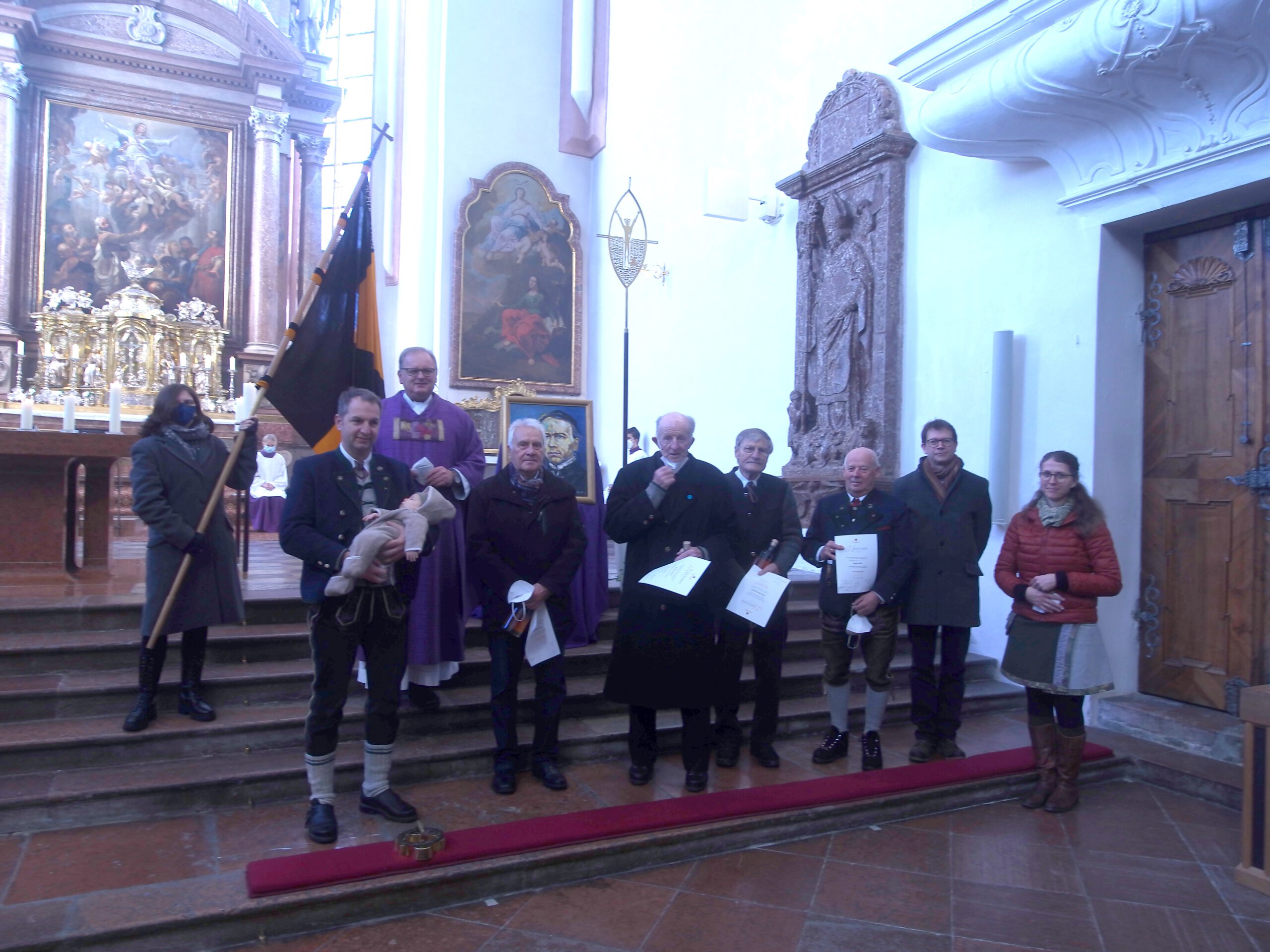 Bannerträgerin Marie Zinner, Martin Beierl mit Tochter Helena, Präses Monsignore Dr. Thomas Frauenlob (25 Jahre Mitgliedschaft), Herrmann Keller (60 Jahre Mitgliedschaft), Gerd Bartel (70 Jahre Mitgliedschaft), Peter Reichenwallner (40 Jahre Mitgliedschaft), Stefan Graßl (60 Jahre Mitgliedschaft), Alexander Dinter (Leitungsteam) und Maria Schmidt (Leitungsteam).
