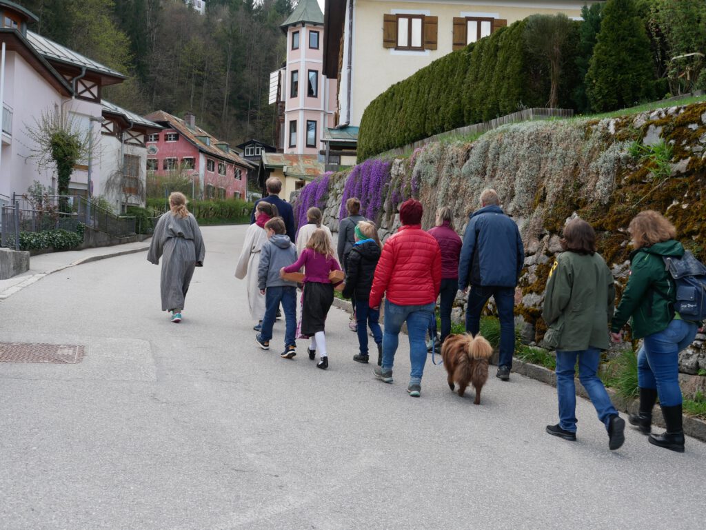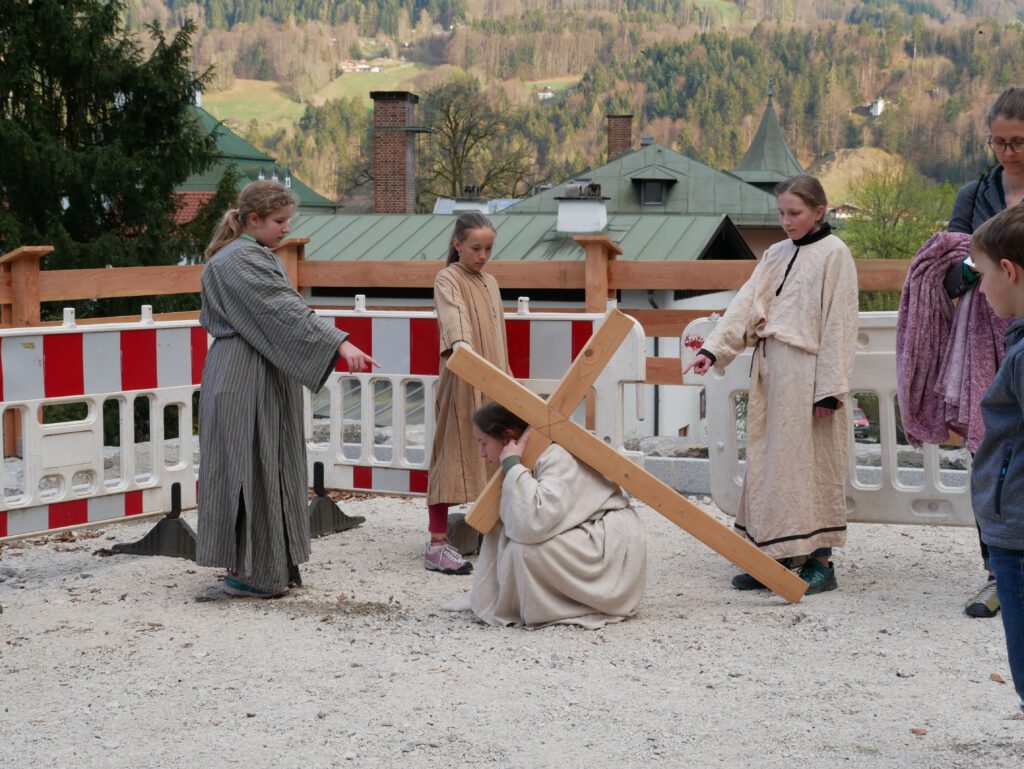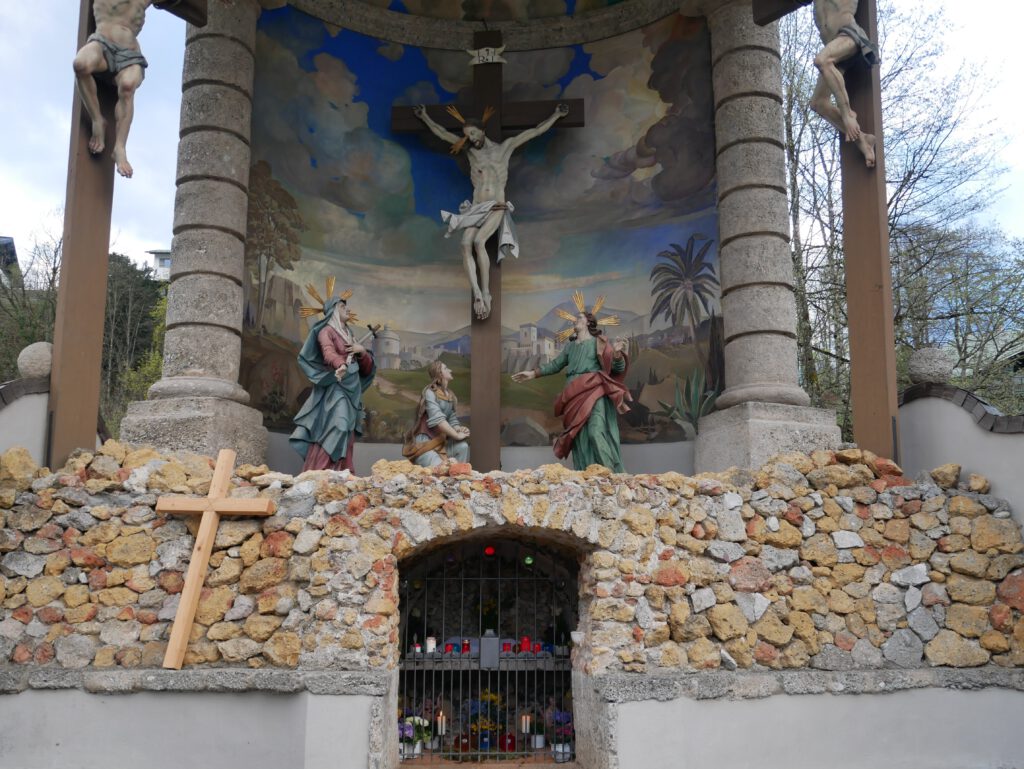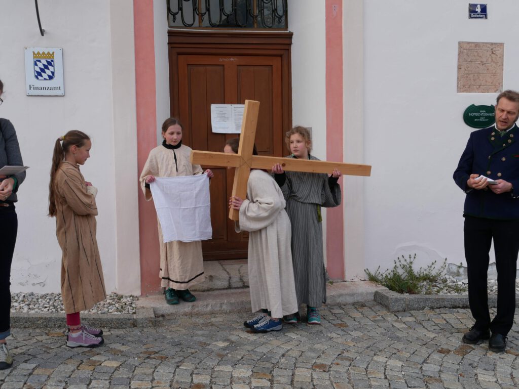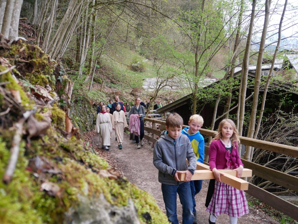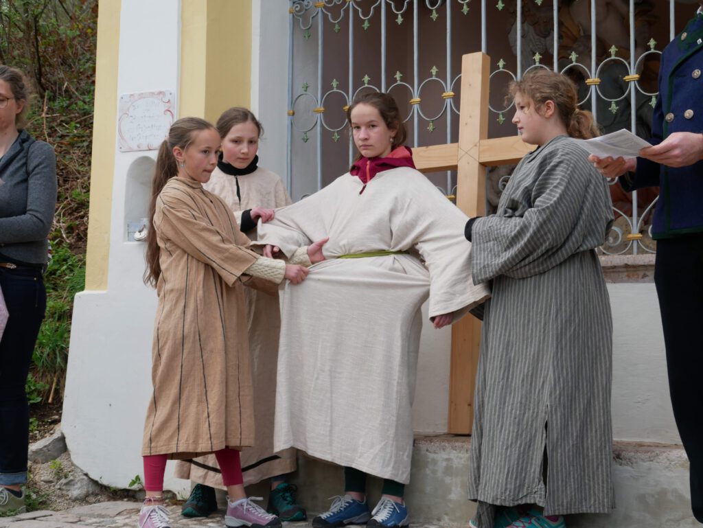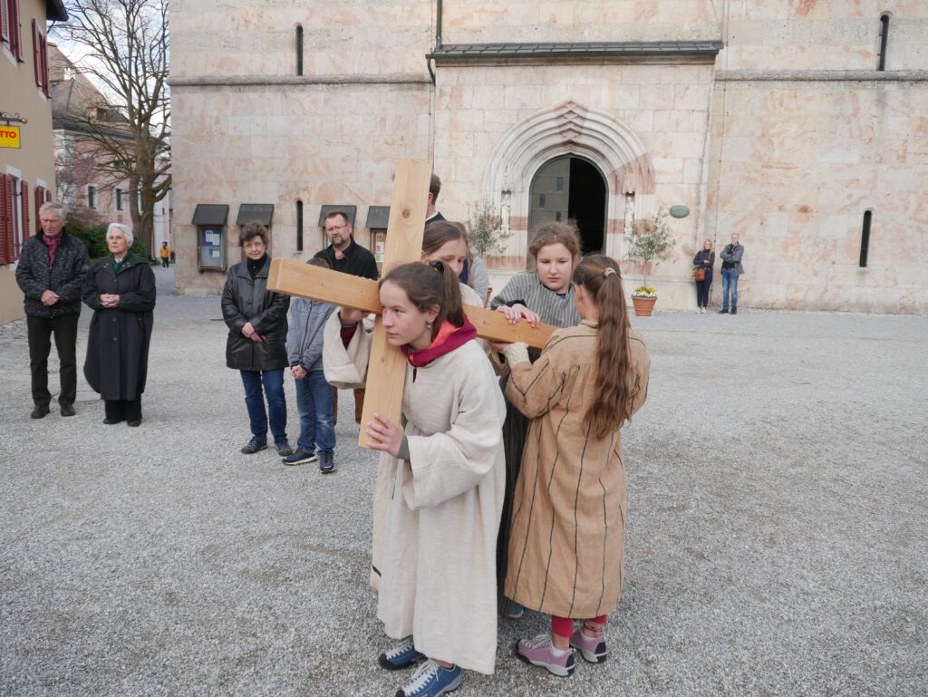 Einen Kreuzweg, im Gedenken an alle vom Krieg betroffenen Menschen, betete die Kolpingsfamilie zusammen mit vielen Gästen am Karfreitagabend. Maria Schmidt und Martin Kienast hatten Impulse und Gedanken zu der gemeinsamen Wanderung vorbereitet. Unterstützt wurden sie dabei von jungen Theaterspielerinnen, die in Standbildern die einzelnen Stationen anschaulich darstellten. Unterwegs wurde gesungen, für Menschen in Notsituationen Fürbitte gehalten und ein Teilstück im Schweigen gegangen. Mit einem gemeinsamen Vaterunser endetet das Gebet auf dem Kalvarienberg.