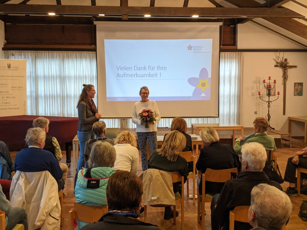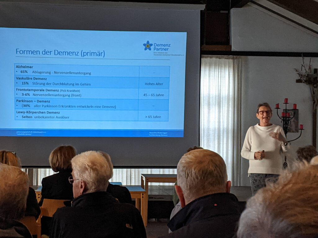50 neue Demenzpartner:innen konnten durch die Schulung von Roswitha Moderegger kürzlich neu gewonnen werden. Maria Schmidt vom Leitungsteam der Kolpingsfamilie Berchtesgaden freute sich über das große Interesse an der Bildungsveranstaltung und bedankte sich bei der Referentin, die sich als wahre Kennerin der Thematik erwies. Mit vielen Erfahrungen und anschaulichen Beispielen klärte sie das interessierte Publikum über das Thema Demenz auf. Neben Hauptmerkmalen, der Häufigkeit und Ursachen von Demenz, berichtete sie von Risikofaktoren, wie z. B. Bluthochdruck, Stress oder geringer sozialer und körperlicher Aktivität. Wichtig war der Referentin, wie man Menschen mit Demenz begegnet. Sie ermutigte unter anderem dazu, Erkrankte weiter sozial einzubinden, auf die Emotionen einzugehen und dabei freundlich und humorvoll zu sein. „Bei Menschen mit Demenz gibt es immer etwas zu lachen!“ Durch die gestiegene Lebenserwartung wird wohl jeder Dritte in Deutschland von einer Form der Demenz betroffen sein. Menschen mit Demenz brauchen Arbeitskollegen, Nachbarn, Freunde, Familienangehörige, die nicht wegschauen, sondern die aufmerksam und verständnisvoll sind. Ziel müsse es sein, dass Menschen mit Demenz möglichst lange in ihrer gewohnten Umgebung leben können. Zum Abschluss erhielten alle Teilnehmer:innen ein Zertifikat als Demenz-Partner. Mittlerweile gibt es in Deutschland über 82000 Demenz-Partner, die dazu beitragen, dass Demenzerkrankungen weniger tabuisiert und Menschen mit Demenz weniger stigmatisiert werden.